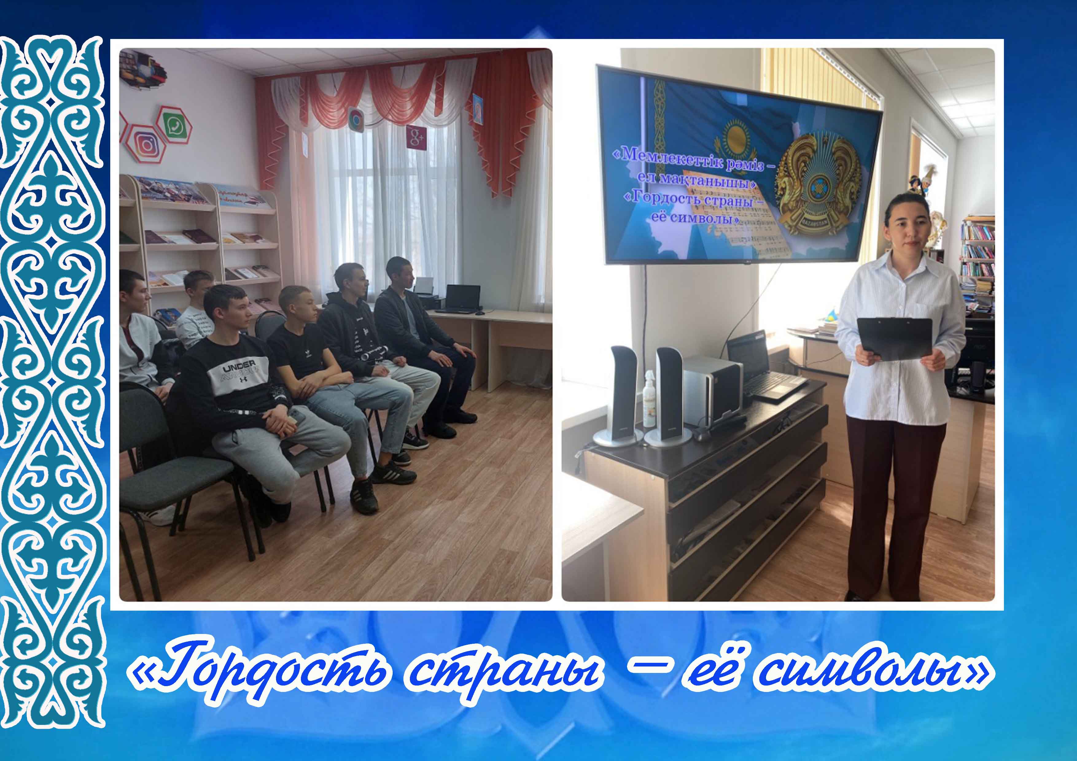 Ко дню Государственных символов Республики Казахстан в читальном зале Карабалыкской центральной районной библиотеки был проведён час знаний «Гордость страны – её символы» со студентами КАТК.