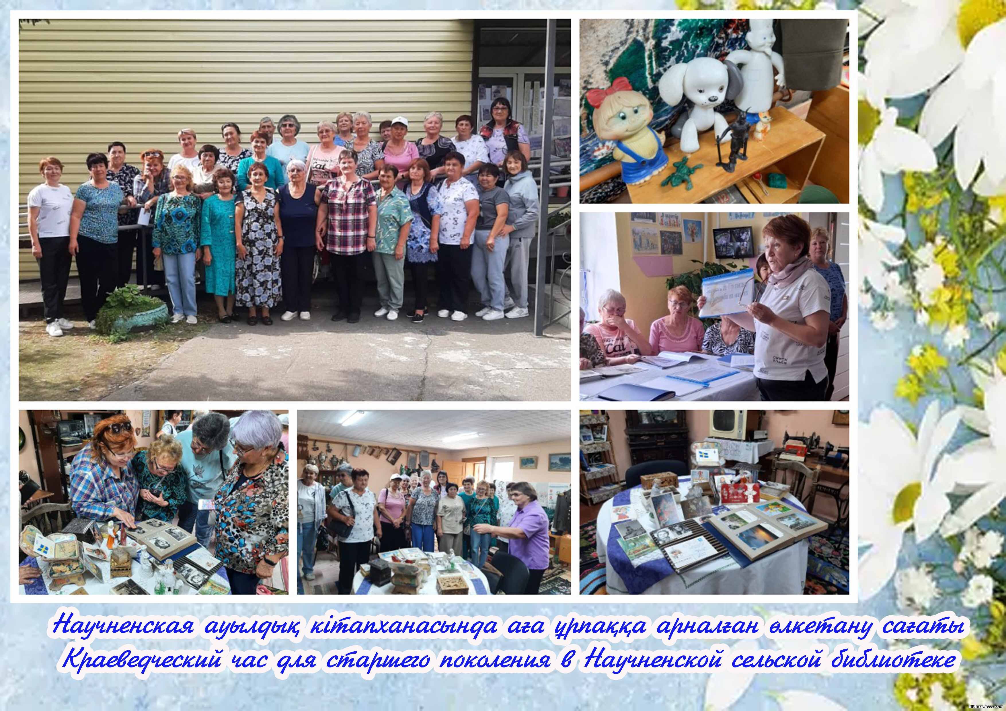 В Научненской сельской библиотеке прошёл тёплый краеведческий час для старшего поколения. В гости были приглашены участники программы «Активное долголетие». Роза Жаксылыковна представила собранные материалы об истории села Научное: альбом «90 лет ТОО КСХОС», папку «Герои ВОВ», а также подборку о первоцелинниках — «Одна судьба на многих». Вспоминали первых целинников, говорили о судьбах, звучала песня «Едут новосёлы».