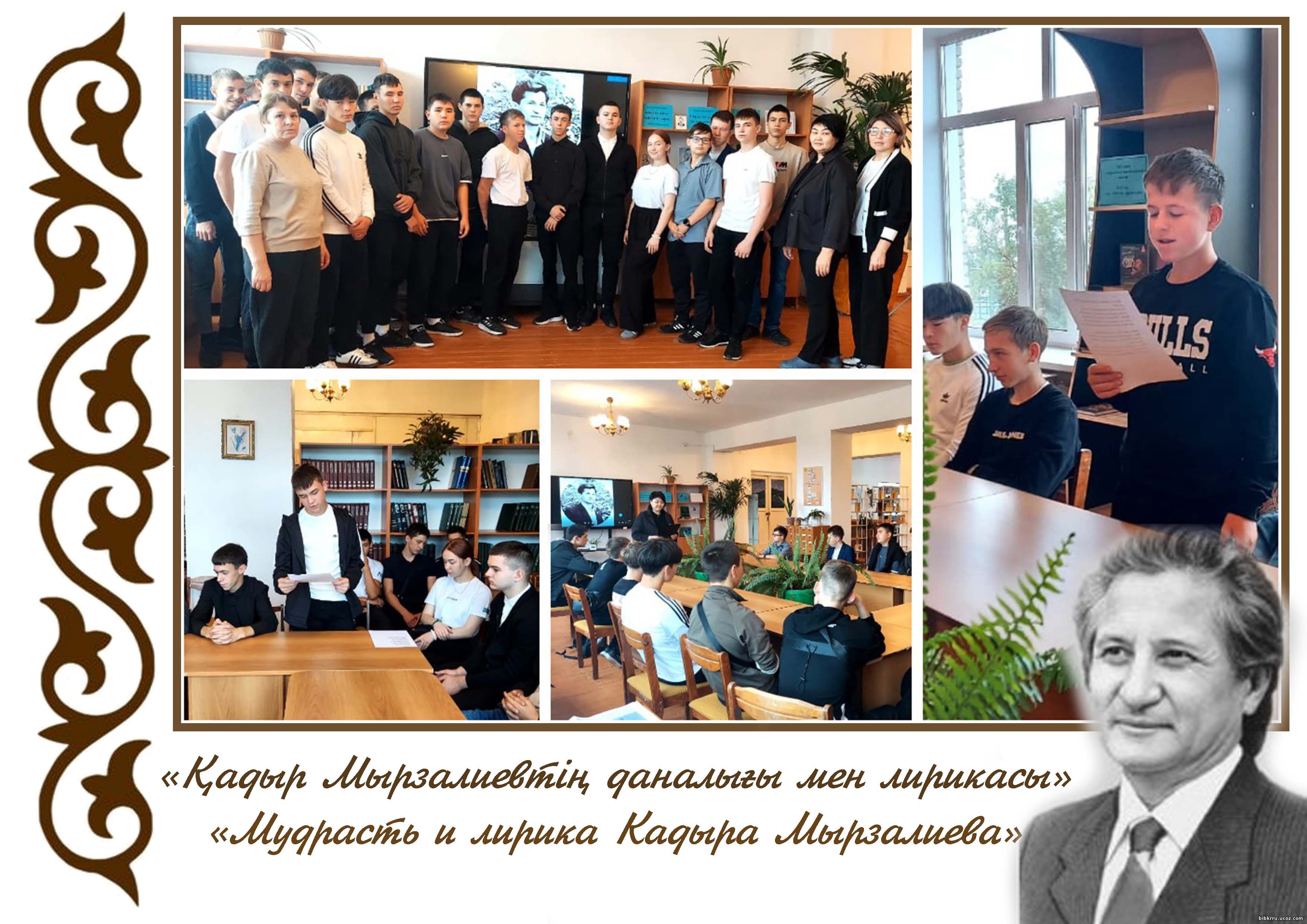 Сотрудник Карабалыкской центральной районной библиотеки для студентов Казахстанского агротехнического колледжа провела час поэзии, посвящённый 90-летию со дня рождения народного писателя Казахстана, поэта Кадыра Мырзагалиева.